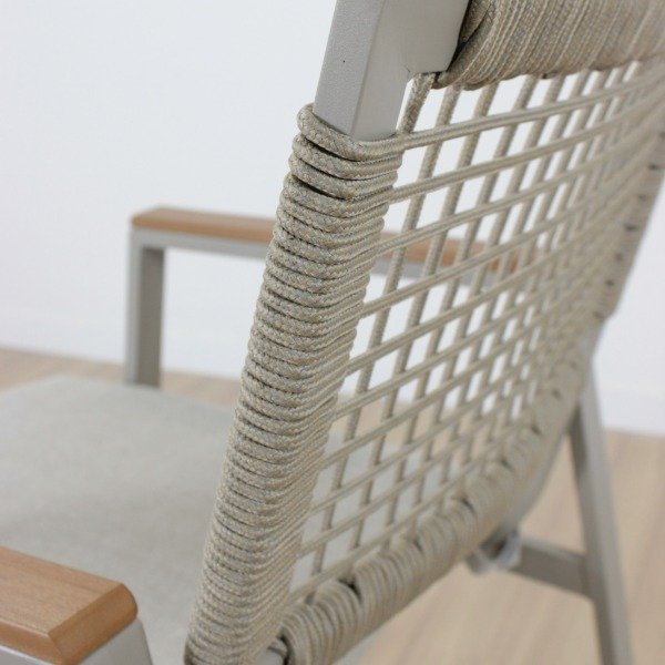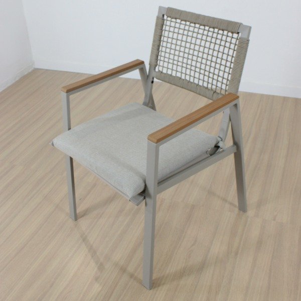 Sillas de hierro, con respaldo cuerda de 4mm, asiento en tela textileno , con almohadones de goma espuma tapizados en tela 100% poliéster lo que lo hace impermeable y super resistente.