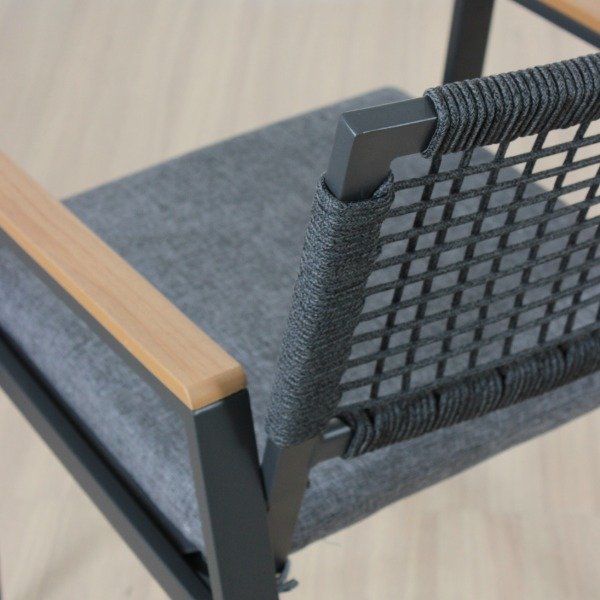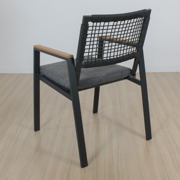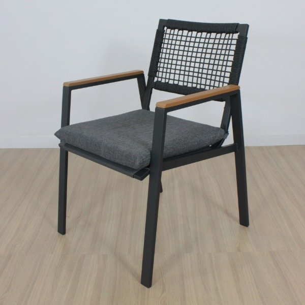 Sillas de hierro, con respaldo cuerda de 4mm, asiento en tela textileno , con almohadones de goma espuma tapizados en tela 100% poliéster lo que lo hace impermeable y super resistente.